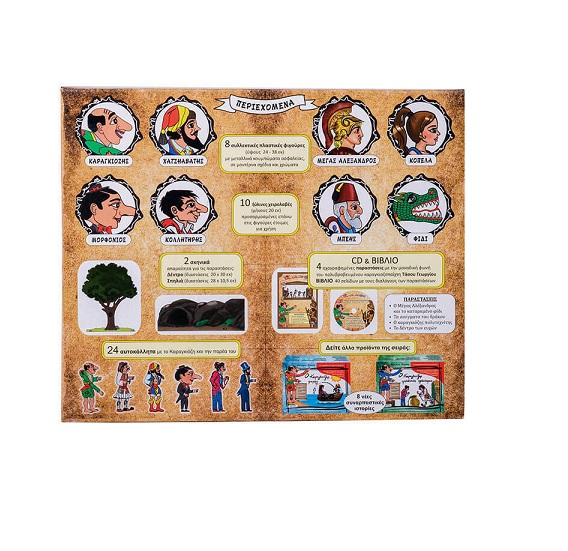 Επίσης περιλαμβάνει 24 αυτοκόλλητα με όλους τους ήρωες της σειράς «Ο Καραγκιόζης και η παρέα του», CD με 4 ηχογραφημένες παραστάσεις καθώς και βιβλίο με τα κείμενα.