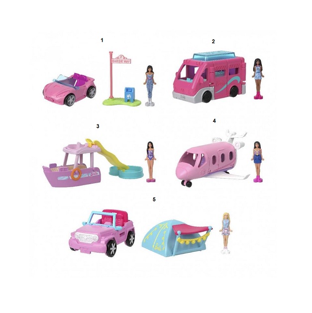 Καλώς ήρθατε στη Mini BarbieLand όπου οι αγαπημένες κούκλες Barbie, τα οχήματα και τα σετ παιχνιδιού έχουν μικροσκοπικό μέγεθος! Τα παιδιά μπορούν να διαλέξουν μεταξύ του Dreamplane, Dreamcamper, Dreamboat, convertible, or Jeep! Κάθε συσκευασία περιέχει ένα όχημα και μία mini κούκλα Barbie. Το σώμα της κούκλας μπορεί να λυγίσει και να τοποθετηθεί μέσα στο όχημα. Color change εκπλήξεις!