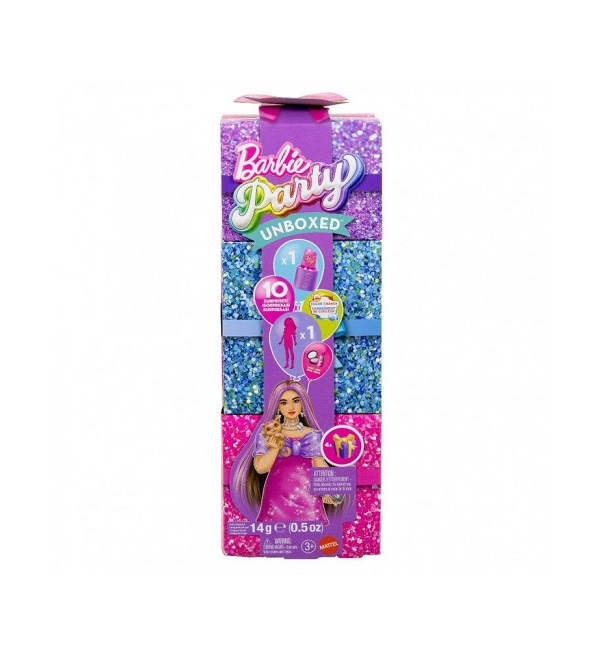 Με 10 εκπλήξεις σε ένα πακέτο, οι κούκλες της σειράς Barbie Party Unboxed Glam Party προσφέρουν μια διασκεδαστική εμπειρία ξεπακετάρισμα με συσκευασία εμπνευσμένη από κουτί δώρου και διασκέδαση με θέμα τη λάμψη! Ξεκινήστε το “ξεκλείδωμα” για να βρείτε μια κούκλα μόδας Barbie, στη συνέχεια αφαιρέστε την πετσέτα μαλλιών και τη μάσκα προσώπου της. Ποια θα ξεκουμπώσετε; Υπάρχουν τρεις για να συλλέξεις, η καθεμία με μοναδική εμφάνιση. Συνέχισε να ξεκουμπώνεις το κουτί για να βρεις κι άλλες εκπλήξεις κρυμμένες σε μια συσκευασία. Χρησιμοποίησε το πινέλο που περιλαμβάνεται για να “τρυπήσεις” κάθε τμήμα του compact και να αποκαλύψεις αξεσουάρ-έκπληξη για την κούκλα Barbie! Στη συνέχεια, ανακάλυψε ένα σωληνάριο εμπνευσμένο από κραγιόν με ζελέ Slime στο εσωτερικό του — θρυμματίστε το ζελέ Slime για να βρείτε τον φίλο κατοικίδιο! Τέλος, αντιστρέψτε την πετσέτα της κούκλας Barbie για να αποκαλύψετε ένα διασκεδαστικό φόρεμα για πάρτι και προσθέστε τα αξεσουάρ της για να ετοιμαστείτε για πάρτι. Περισσότερες εκπλήξεις περιλαμβάνουν αλλαγή χρώματος στο πρόσωπο και τα μαλλιά της κούκλας — απλά χρησιμοποιήστε παγωμένο και ζεστό νερό για να μεταμορφωθείτε, να αλλάξετε πάλι και να επαναλάβετε ξανά και ξανά! Τα παιδιά θα λατρέψουν να ανακαλύπτουν εκπλήξεις για να βοηθήσουν την κούκλα Barbie να ετοιμαστεί για πάρτι και μπορούν να συλλέξουν όλες τις κούκλες Barbie Party Unboxed για να συνεχίσουν τη διασκέδαση! Κάθε κούκλα πωλείται ξεχωριστά, ανάλογα με τη διαθεσιμότητα. Οι κούκλες δεν μπορούν να σταθούν μόνες τους.