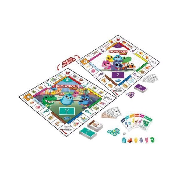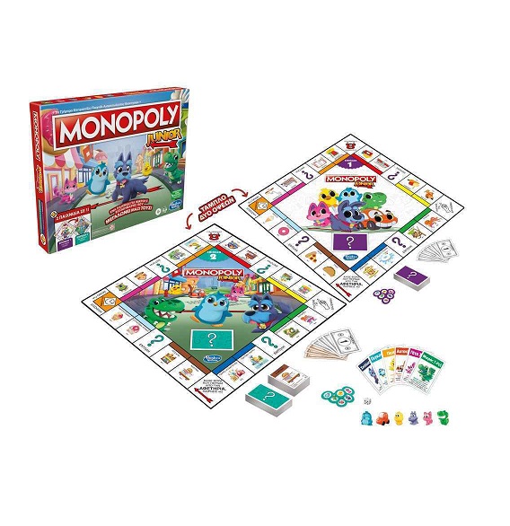 Η Monopoly Junior 2 σε 1 είναι το παιχνίδι που μεγαλώνει μαζί με το παιδί σας! Το ταμπλό διπλής όψεως προσφέρει 2 επίπεδα παιχνιδιού, ώστε οι οικογένειες να μπορούν να αποφασίσουν ποιο επίπεδο είναι καλύτερο για αυτές. Το παιχνίδι Επιπέδου 1 που προτείνεται για ηλικίες 4 5 ετών, βοηθά τα παιδιά να εξασκηθούν στην αντιστοίχιση και τη μέτρηση, καθώς μετρούν κενά, ταιριάζουν εικόνες και αγοράζουν ακίνητα. Ο παίκτης με τα περισσότερα ακίνητα κερδίζει! Είστε έτοιμοι να ανεβείτε ένα επίπεδο Αναποδογυρίστε το ταμπλό για το πιο προηγμένο παιχνίδι Επιπέδου 2 που συνιστάται για ηλικίες 6 ετών και άνω, που εστιάζει στην ανάγνωση και στα απλά μαθηματικά. Οι παίκτες μπορούν να αγοράσουν ακίνητα, να εισπράξουν ενοίκια και να ανακαλύψουν την περιουσία τους! Για να κερδίσετε, πρέπει να γίνετε ο παίκτης με τα περισσότερα χρήματα Το παιχνίδι σε κάθε επίπεδο χρησιμοποιεί το δικό του σύνολο χρημάτων και καρτών Monopoly καθώς και τους δικούς του κανόνες Και τα δύο παιχνίδια περιλαμβάνουν 6 χαριτωμένα πιόνια!