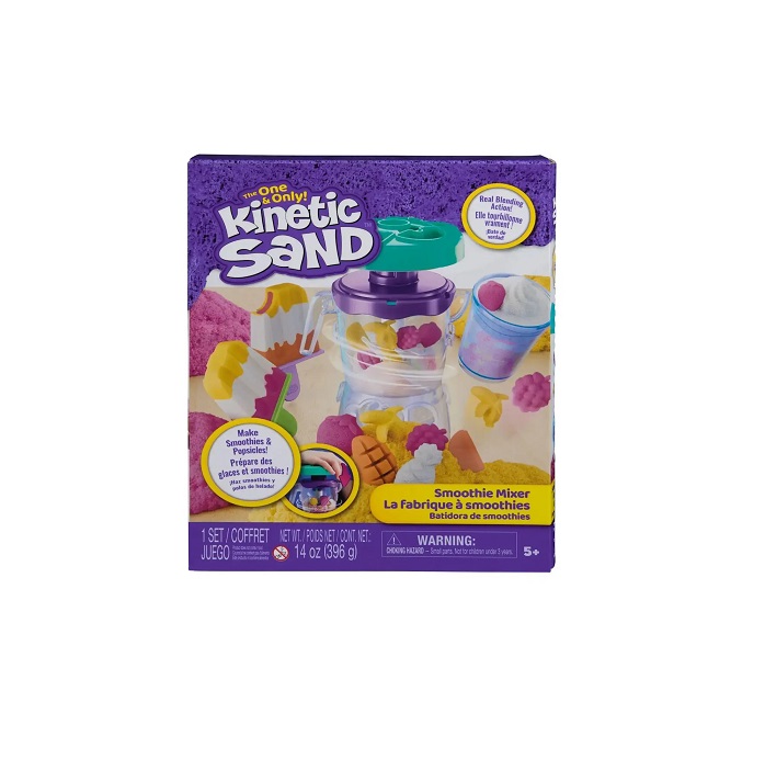 Με το Kinetic Sand Smoothie Mixer, τα παιδιά μπορούν να φτιάξουν φανταστικά σμούθι και πολύχρωμες γρανίτες χρησιμοποιώντας τη μαγική άμμο Kinetic Sand. Το σετ επιτρέπει στα παιδιά να δημιουργούν στρώσεις, να αναμειγνύουν υλικά και να σχηματίζουν φρούτα, όπως θα έκαναν με ένα πραγματικό μίξερ.